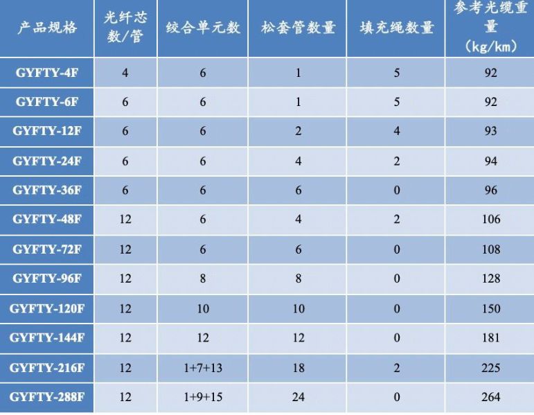注:1.表中參數為GYFTY典型結構參數,我司可提供2~288芯任意規格或特殊結構參數的GYFTY光纜。