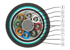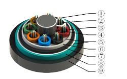 1 光纖、 2 纖膏、 3 松套管、 4 鋼絲、 5 阻水纜膏、 6 雙面涂塑皺紋鋁帶、 7 LSZH內護套、 8 雙面涂塑皺紋鋼帶、 9 LSZH外護套