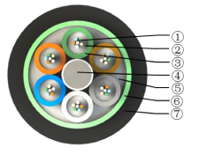 1 光纖、2 纖膏、3 松套管、4 鋼絲加強件、5 阻水纜膏、6 雙面涂塑皺紋鋼帶、 7 LSZH外護套