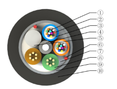 1 光纖、 2 纖膏、 3 松套管、 4 鋼絲加強件、5 填充繩(可能有)、 6 撕裂繩(可能有)、7 阻水纜膏、 8 銅導線、 9 雙面涂塑鋁帶、 10 PE外護套